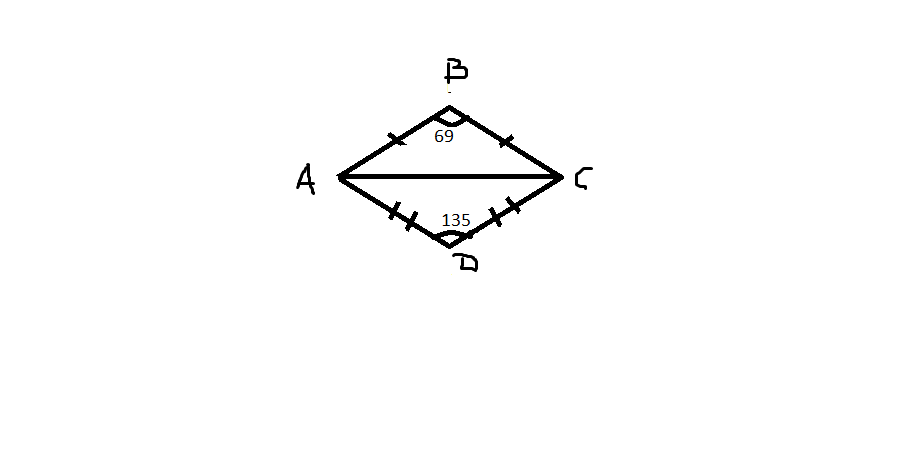 В выпуклом четырехугольнике ABCD AB=BC,AD=CD,угол B =69 градусов,угол D=135 градусов!найти угол А