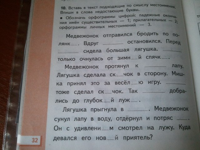 Медвежонок протянул к ней лапу . Лягушка сделала скачок в сторону. Мишка принял это за весёлую игру . Он тоже сделал скачок . Так они добрались до глубокой лужи.