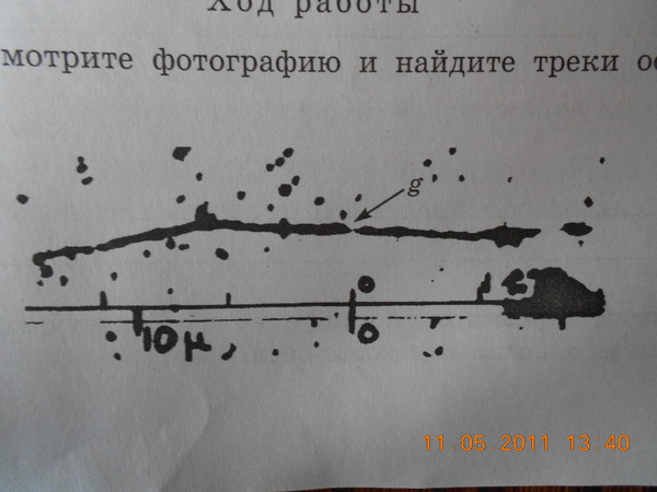 На фотографии вы видите треки двух осколков, образовавшихся при делении ядра атома урана, захватившего нейтрон. Ядро урана находилось в точке g, указанной стрелочкой. По трекам видно, что осколки ядра атома урана разлетелись в противоположных направлениях (излом левого трека объясняется столкновением осколка с ядромодного из атомов фотоэмульсии, в которой он двигался).
