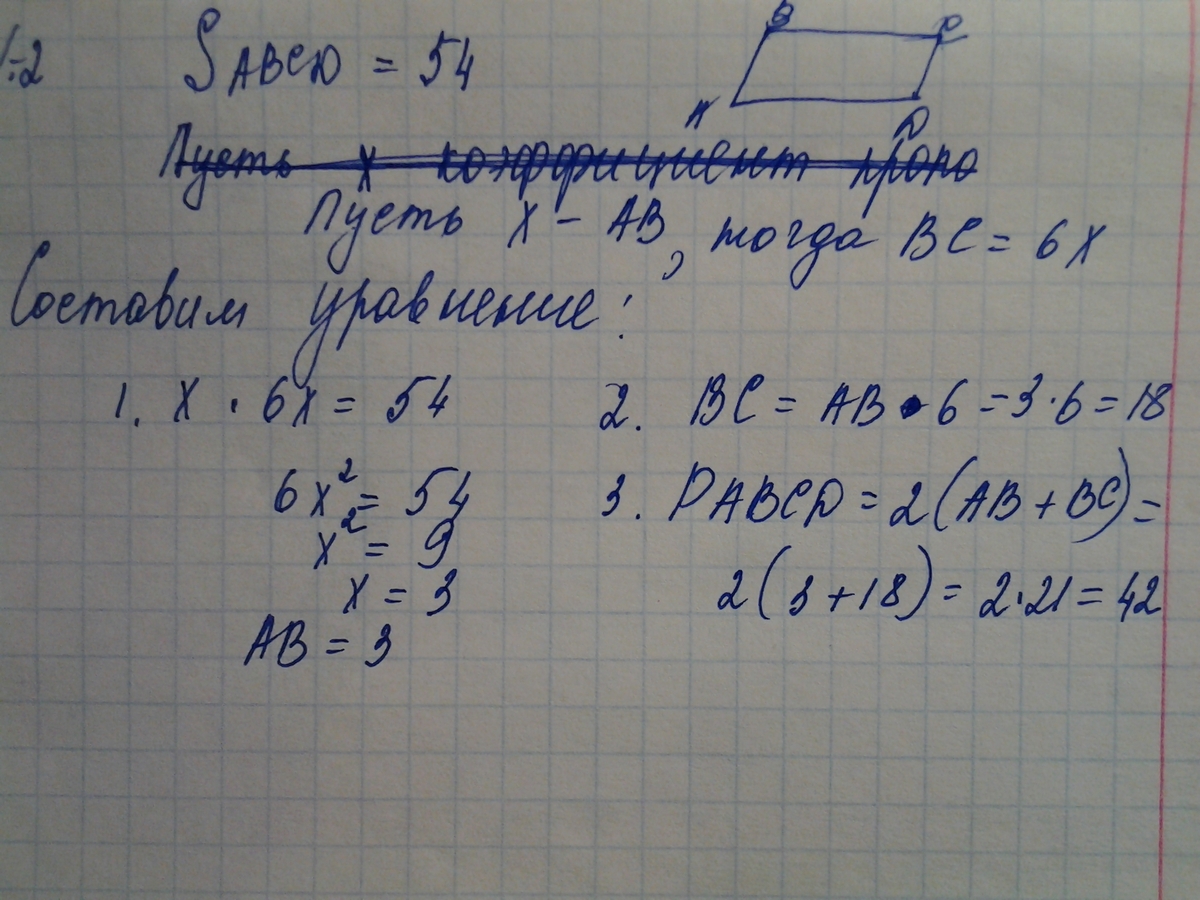 1.Боковая сторона равнобедренного треугольника равна 19.Из точки,взятой на основании этого треугольника проведены две прямые параллельные боковым сторонам.найдите периметр получившегося параллелограмма.2.найдите периметр прямоугольника если его площадь равна 54 а одна из сторон ровно в 6 раз больше другой стороны