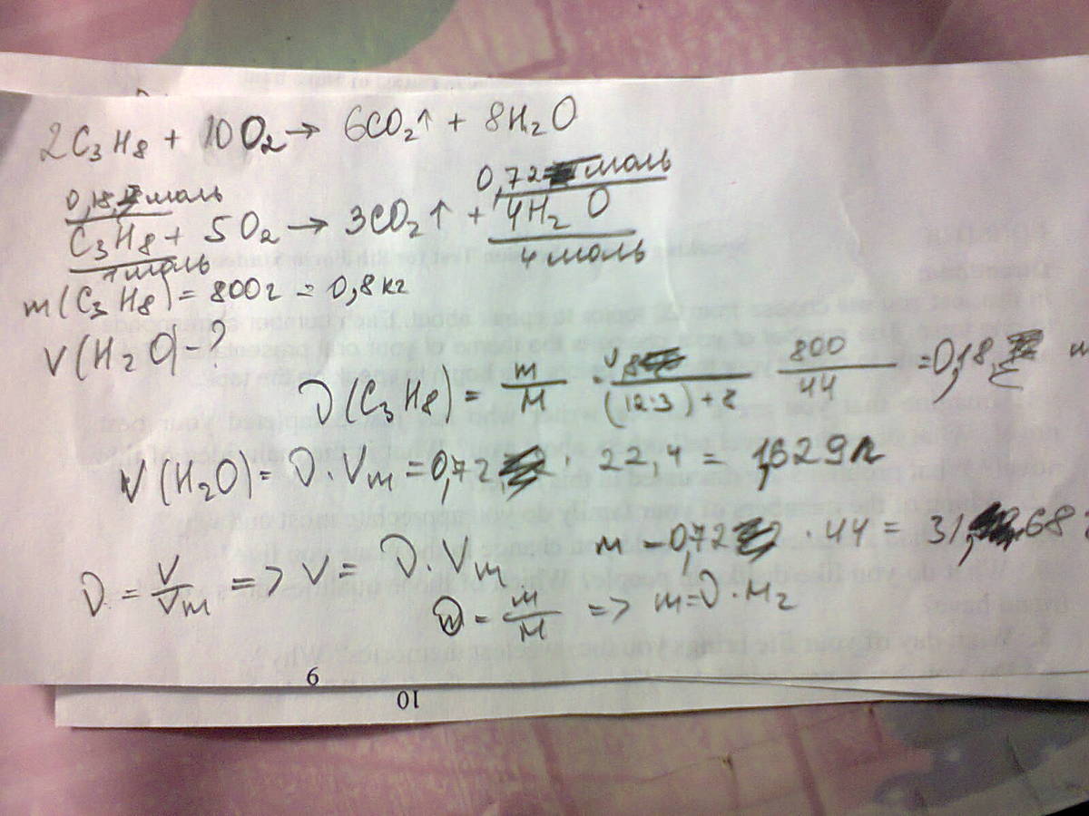 какова масса и объем водяного пара который образуется при сгорании 800 грамм пропана? выручайте пожалуйста