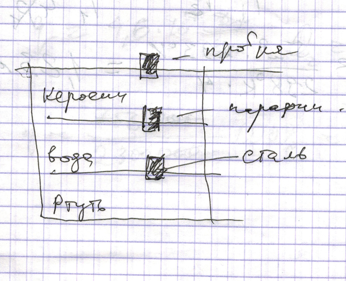 как в сосуде, содержащем воду, керосин, ртуть расположаться три сплошных шарика: пробковый, парафиновый, стальной?