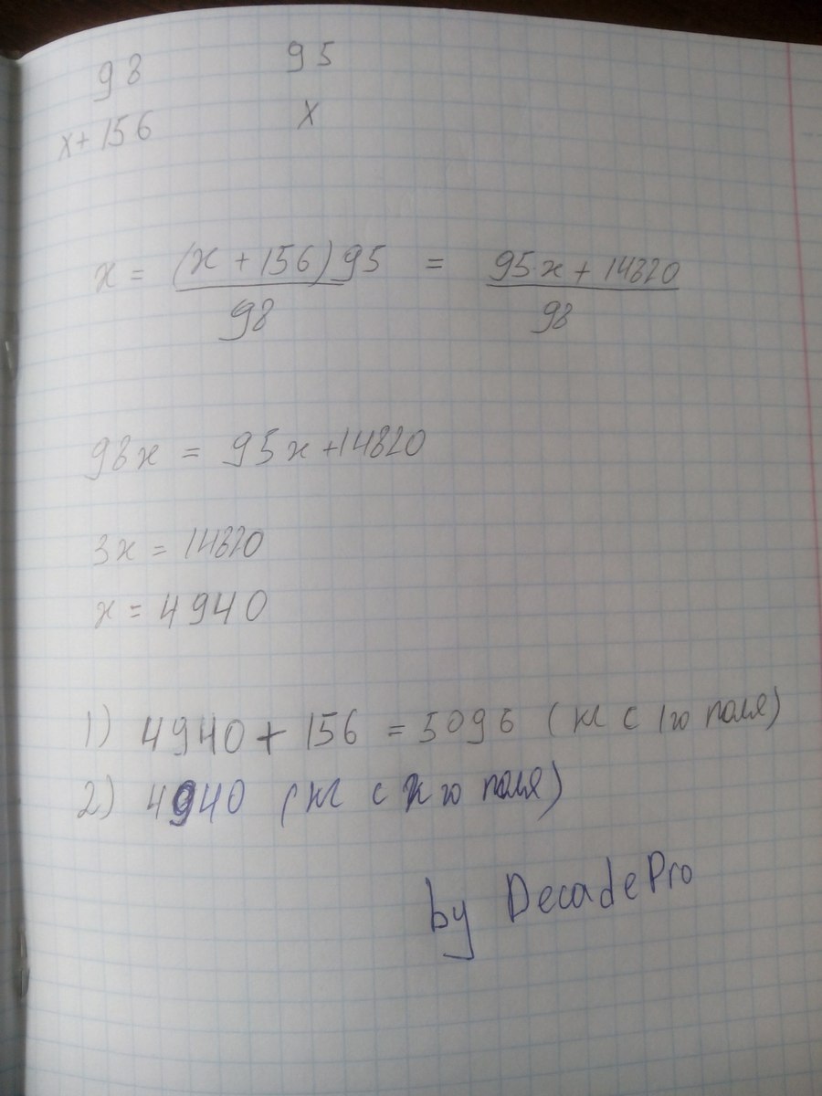 С первого поля собрали 98 мешков картофеля,а со второго-95 таких же по массе мешков.Сколько килограммов картофеля собрали с каждого поля,если с первого поля собрали на 156 кг больше,чем со второго?