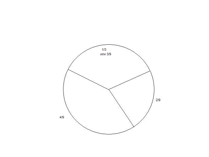 Начертите окружность и проведите в ней три радиуса так , чтобы один центральный угол опирался на 1/3 окружности, а другой- на 2/9 окружности. На какую часть окружности будет опираться третий центальный угол?