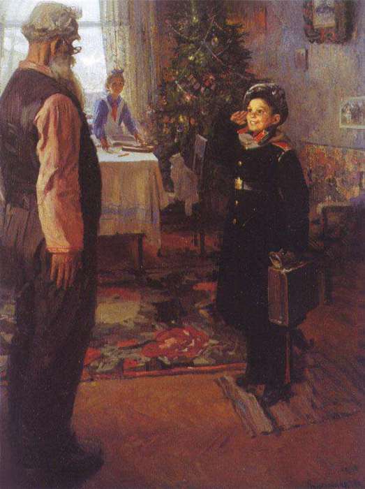 Выправка, блеск в глазах и кончики пальцев у виска. Шапка идеально "сидит" на голове мальчика, портфель держит уверенно и отдает честь пожилому человеку. Улыбка до ушей яркая и искренняя. Красные погоны украшают плечи паренька, а из под шапки выглядывает непослушное ухо. Пояс поверх верхней одежды украшается яркой золотистой пряжкой, что очень идёт молодому бойцу. Небольшой румянец на щеках придаёт ему детские черты лица. Ноги вместе, носочки врозь. Прям стоит по стойке смирно. Высокие валенки или же ботинки. Тёмные штаны выглажены,