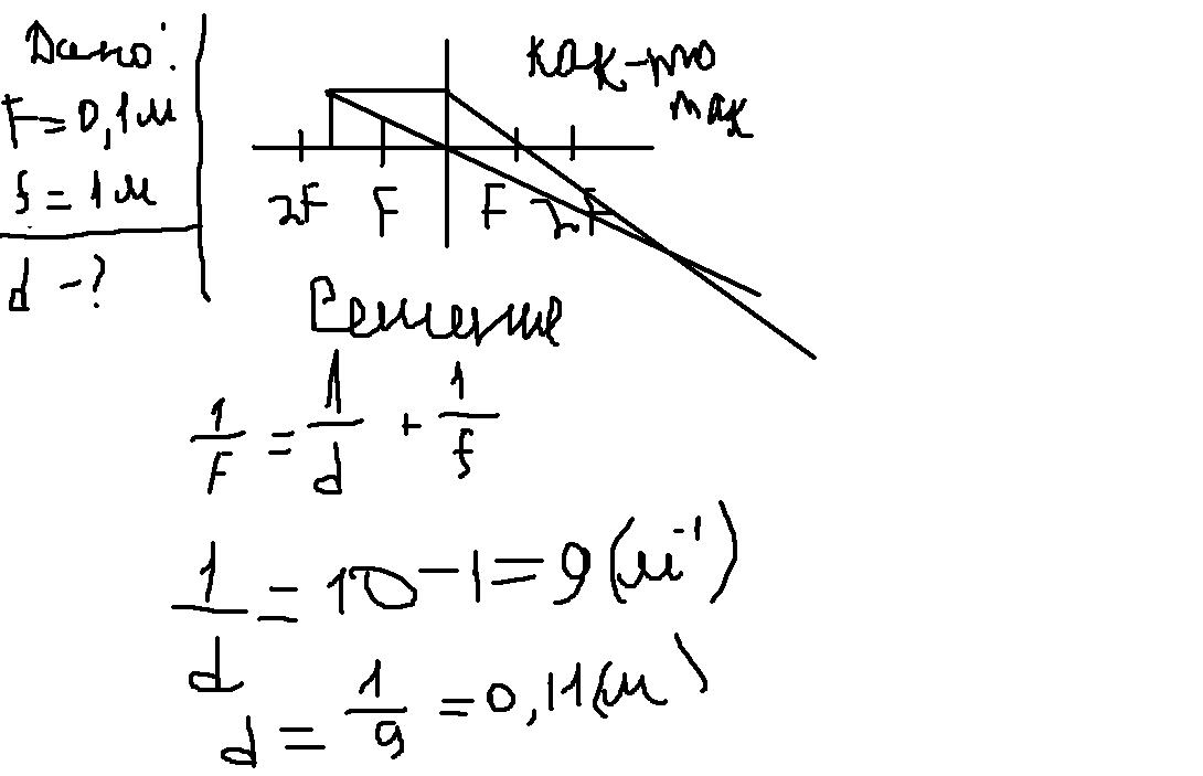 Найти растояние от линзы до предмета , если фокусное растояние = 10 см , а растояник от линзы до изображения 1м , и построить изображение