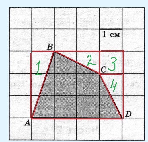 КТО ХОРОШО ПОНИМАЕТ РЕШЕНИЕ,ОБЪЯСНИТЕ ПОЖАЛУЙСТА!!!найдите площадь четырехугольника abcd размер каждой клетки 1 см х 1 см.ИЗАБРАЖЕНИЕ ВНИЗУ!!!