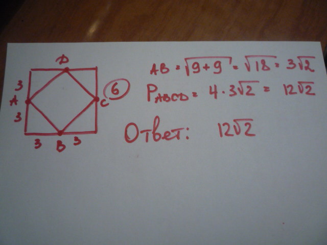середины сторон правильного четырёхугольника со стороной 6 см последовательно соединены.найдите периметр получившегося многоугольника
