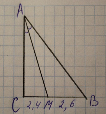 Поскольку АМ биссектриса то выполняется соотношение АС/АВ=СМ/ВМ=2,4/2,6. Пусть единица пропорции равна Х, тогда АС=2,4Х, АВ=2,6Х. По теореме Пифагора. АСквадрат+ВСквадрат =АВквадрат, (2,4Х)квадрат+25=(2,6Х)квадрат . 5,76Хквадрат+25=6,76Хквадрат. Отсюда Х=5. Тогда АС=2,4*5=12, АВ=2,6*5=13. Искомый периметр равен Р=АС+ВС+АВ=12+5+13=30.