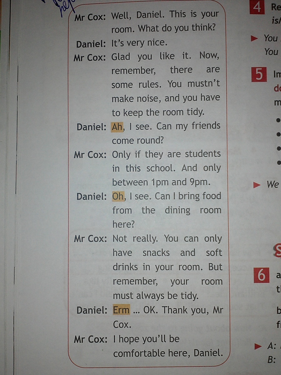 М-р Кокс: Конечно нет. Ты только можешь держать в своей комнате закуски и безалкогольные напитки. Но помни, что твоя комната должна всегда быть чистой.