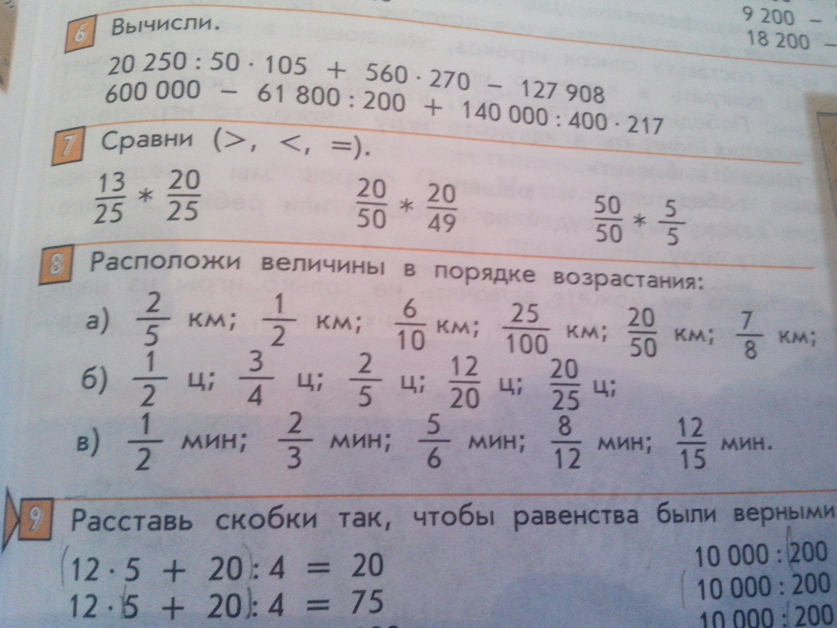 а) 25/100 км ; 2/5 км ; 20 /50 км ; 1/2 км ; 6/10 км ; 7/8 км