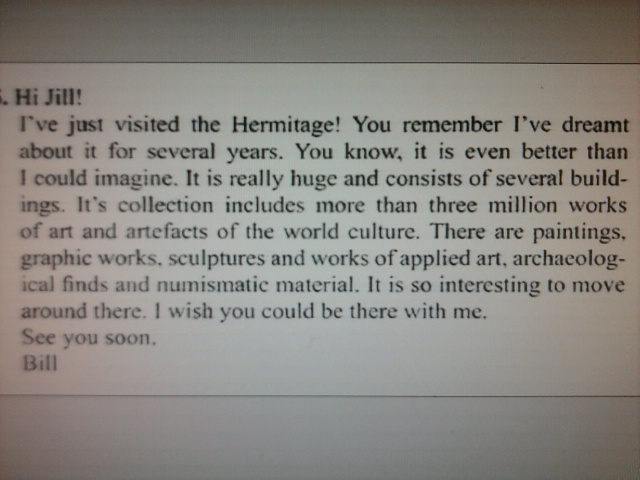Я только что посетил Эрмитаж! Ты помнишь я мечтал об этом в течение нескольких лет. Ты знаешь, это даже лучше чем я мог себе представить. Это действительно огромный и состоит из нескольких зданий. Коллекция включает в себя более 3 миллионов произведений искусства и артефакты мировой культуры. Там находятся картины, графические работы ,скульптуры и работы декоративно-прикладного искусства, архиологические раскопки и нумизматический материал. Это очень интересно передвигаться там. Я желаю вам быть там со мной. Скоро увидимся.