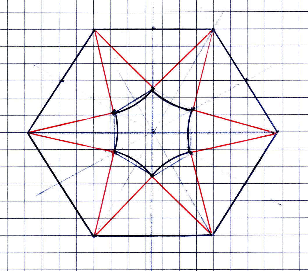 На чертеже хорошо видно, что из площади шестиугольника надо вычесть площадь шести равнобедренных прямоугольных треугольников со стороной шестиугольника длины 2 в качестве гипотенузы, и площади шести секторов с углом раствора 30 градусов (угол шестиугольника 120, минус 2 раза по 45) и радиусом корень(2);