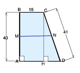 на рисунке:abcd-трапеция, ad и bc-основания, mn-средняя линия, угол a=90 градусов, ab=40 см, cd=41 см, bc=15 см найти mn