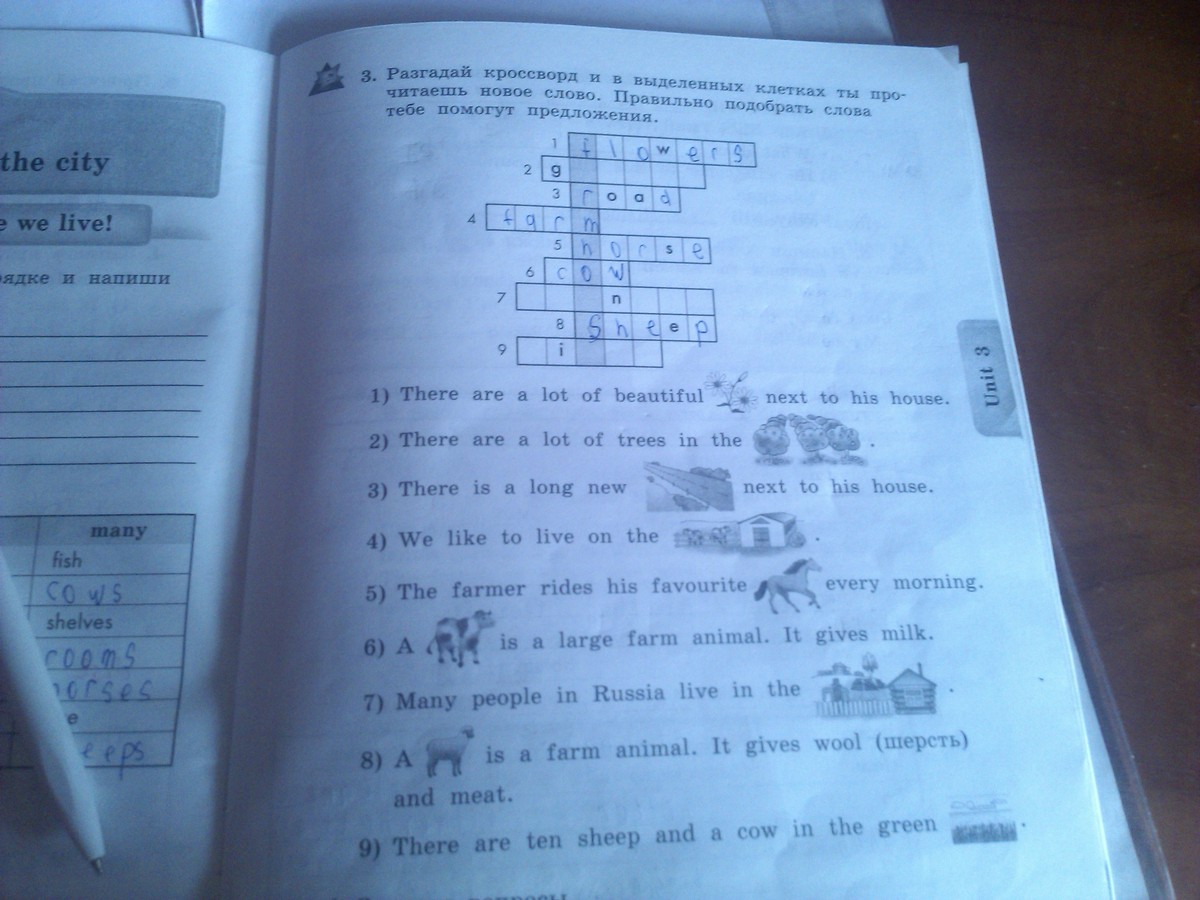 2) garden(сад) 7) country(деревня) 9) field(поле, луг) все что там сделано, это правильно. В середине получается Farmhouse(дом в деревне, на ферме)
