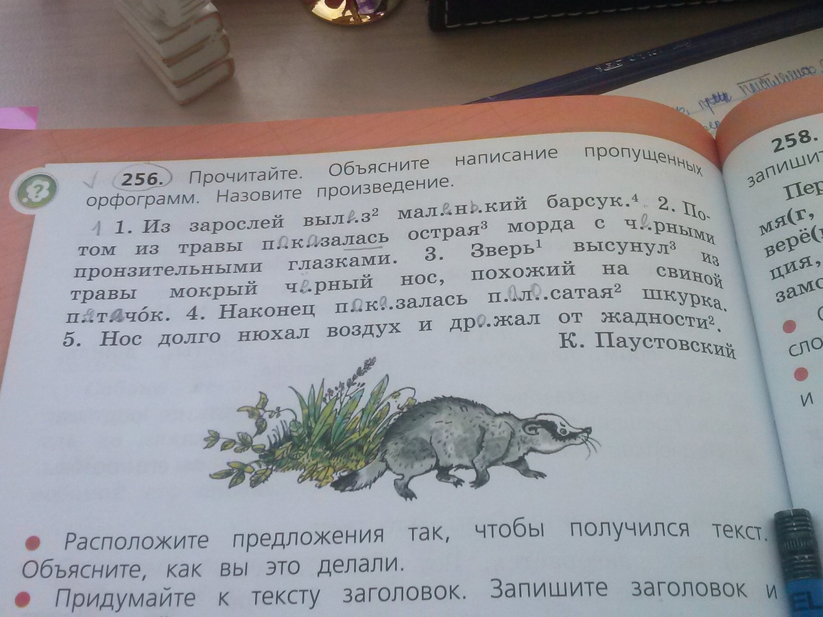 Зверь высунул из травы мокрый чёрный нос,похожий на свиной пятачок ..Нос долго нюхал воздух и дрожал от жадности . Потом из травы показалась острая морда с чёрными пронзительными глазками.Наконец показалась полосатая шкурка.Из зарослей вылез маленький барсук.
