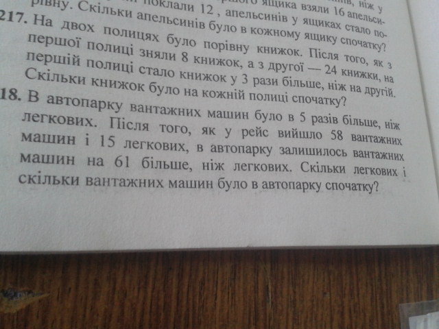 В автопарку було вантажні і легкові машини. Вантажних було в 5 разів більше чим легкових. Коли виїхали 58 вантажних і 15 легкових, вантажних стало на 61 більше. Скільки машин було з