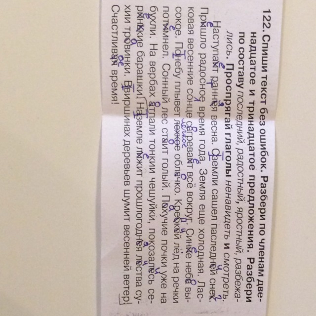 Наступает ранняя весна.С земли сошёл последний снег.Пришло радостное время года.Земля ещё холодная.Ласковое весеннее солнце согревает всё вокруг.Синее небо высокое.По небу плывёт лёгкое облачко.Крепкий лёд на речке потемнел.Сонный лес стоит голый.Пахучие почки уже набухли.На вербах отпали тонкие чешуйки,показались серенькие барашки.На земле лежит прошлогодняя листва,сухие травинки.В вершинах деревьев шумит весенний ветер.Счастливое время!