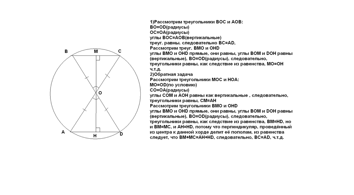 2)Радиусы по-прежнему равны. Здесь рассматриваем уже прямоугольные треугольники, на которые разбивают высоты наших треугольников (они же биссектрисы и медианы в связи с тем, что треугольники равнобедренные). Получается, что все 4 треугольника равны между собой по гипотенузе (радиус) и катету (высоте), а значит, что и "большие" треугольники равны между собой, т.к. составляющие их геометрические фигуры соответственно равны. А это, в свою очередь, значит, что в этих треугольниках все соответственные элементы равны, в том числе и хорды окружности, ч.т.д.