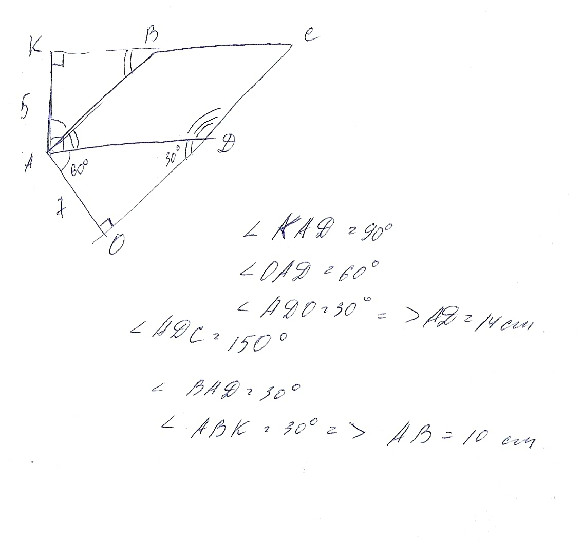 высоты параллелограмма проведенные из вершины острого угла образуют угол 150 и равны 5 см и 7 см найдите стороны параллелограмма