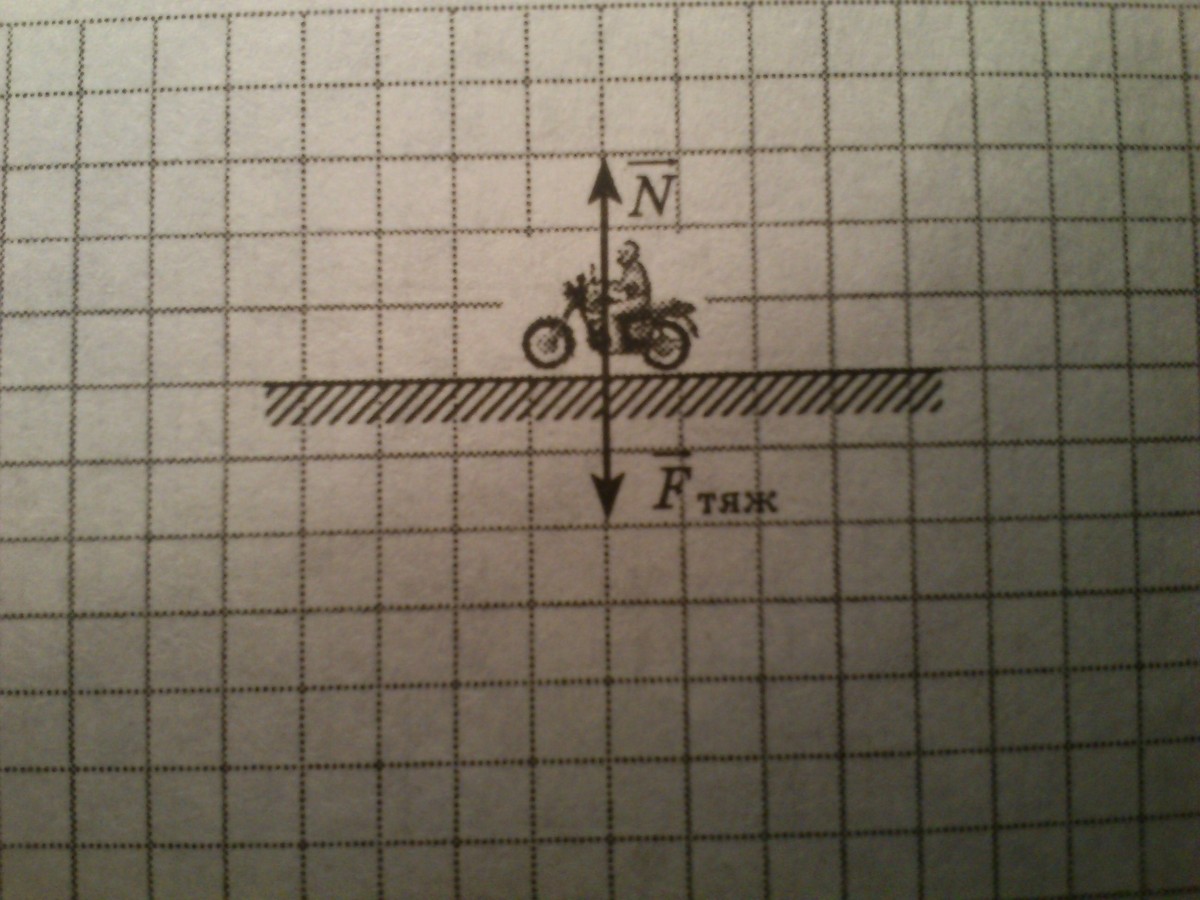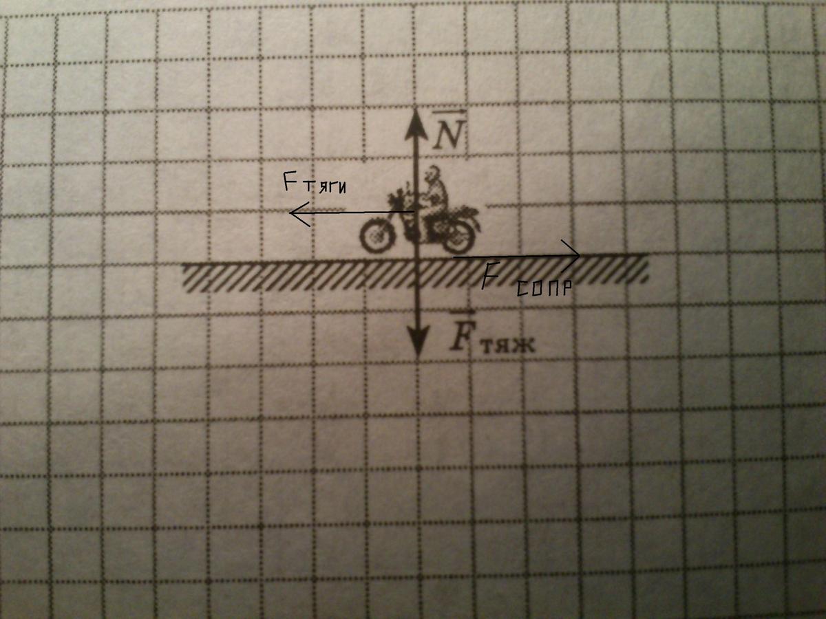 1. Мотоцикл, масса которого вместе с мотоциклистом равна 180 кг, розганяеться на горизонтальном участке шоссе (см. вложение). Коэффициент сопротивления движению равен 0.04. Изобразите на рисунке силы, изображений которых не хватает, и направление ускорения движения мотоциклиста. Определите силу тяги мотоцикла, если ускорение его движения равно 3 м/с(в квадрате).