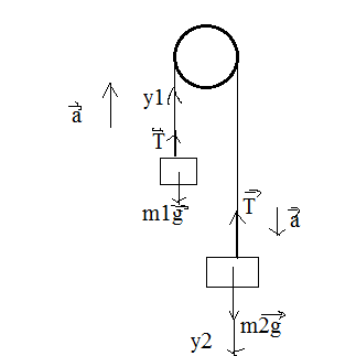введем ось у1 ввертикально вверх , в проекциях получим: Т-m1g=m1a