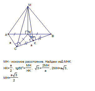 Точка М равноудалена от всех вершин равнобедренного прямоугольного треугольника АВС, АС=СВ=а. Плоскость МВС составляет с плоскостью АВС угол 60 градусов. Найдите расстояние от точки М до плоскости АВС пожалуйста:)