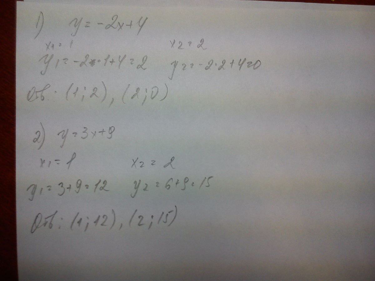 1)Не строя график, найдите координаты точек пересечения графика функции с осями координат. 1)y=-2x+4 2)y=3x+9