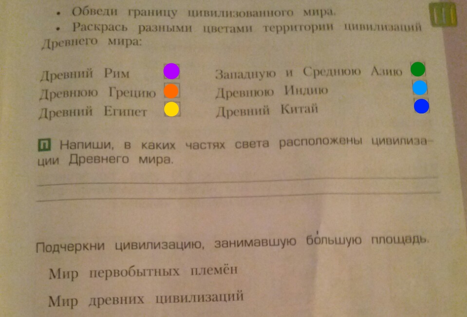 любыми раскрась но вообще Рим синим, Грецию серым, Египет жёлтым, Азию оранжевым или можешь белым так и оставить, Индию коричневым, Китай красным))