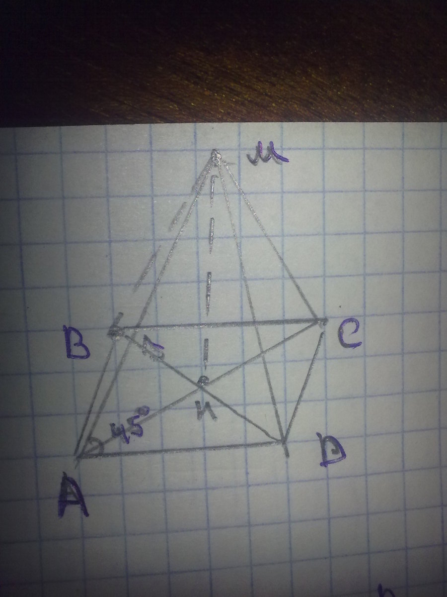 Боковое ребро правильной четырёхугольной пирамиды равно 4 см и образует с плоскостью основания пирамиды угол 45градусов. а)Найдите высоту пирамиды б)Найдите площадь боковой поверхности пирамиды.