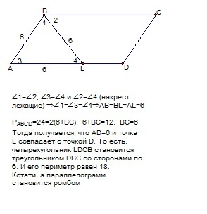 Перимеугол параллелограмма ABCD равен 24. Биссектриса угла ABC пересекает сторону AD в точке L. Найдите периметр LDCB, если углы BAL и ALB равны, а сторона AB=6.