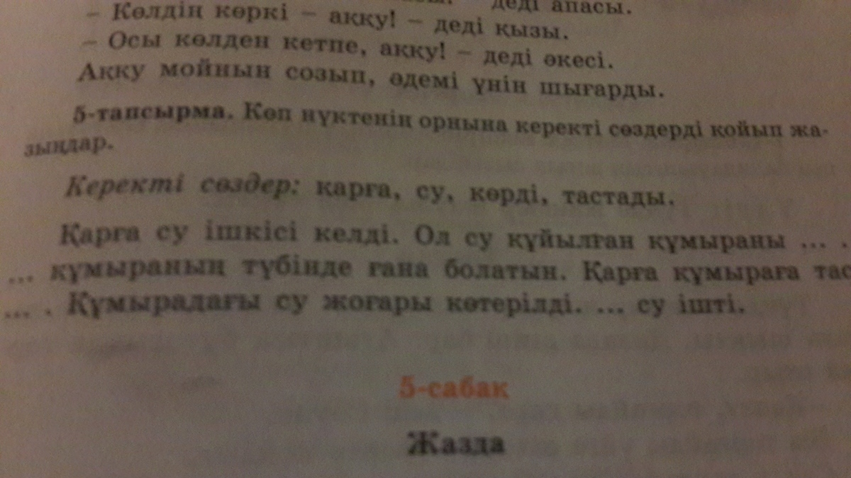 Карга су ишкиси келди. Ол су куйылган кумыраны корди. Су кумыранын тубинде гана болатын. Карга кумырага тас тастады. Кумырадагы су жогары котерилди . Карга су ишти ....