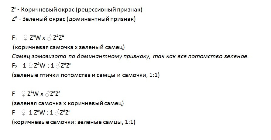 Данная задача про признак, сцепленный с полом. У птиц самки гетерогаметные (ZW), а самцы гомогаметные (ZZ). Так как из условия: «Коричневые самки скрещивались с самцом,имеющим зелёную окраску оперения» мы узнали, что все птички в первом поколении зеленые, значит зеленый подавляет коричневый окрас и зеленые – доминантный признак. Ген окраса находится на хромосоме половой хромосоме Z и сцеплен с полом.