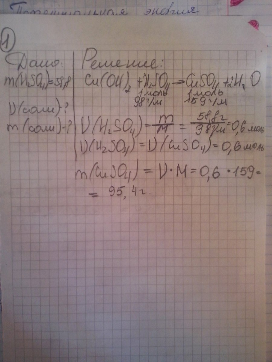 1) Рассчитайте массу и количество вещества соли, полученной при взаимодействии серной кислоты массой 58,8 г, с избытком гидроксида меди(2). Уравнение химической реакции: Cu(OH)2 +H2SO4=CuSO4 + 2H2O.