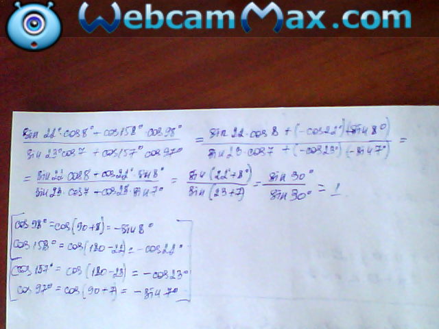 вычислите: sin22(градусов)cos8(градусов) + cos158(градусов)cos98(градусов) / sin23(градусов)cos7(градусов) + cos157(градусов)cos97(градусов)