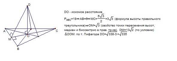 Периметр рівностороннього трикутника дорівнює Р. Точка М віддалена від кожної сторони трикутника на b. Знайдіть відстань від точки М до площини трикутника , якщо:1) Р=18см, b=13 квадратний корінь з 2 см;2) Р=9 квадратний корінь з 3 см , b=3 см.