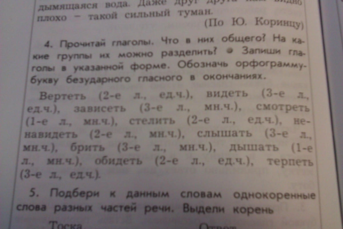 ты вертишь,он,она,оно видет,они зависят,мы смотрим,ты стелишь,вы ненавидете,они слышат,они бреют,мы ды дышим,ты обижаешь,он,она,оно терпит.