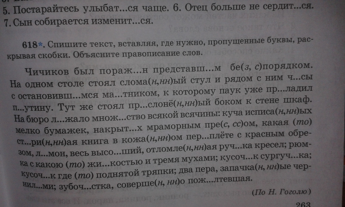 Чичиков был поражен представшим беспорядком. На одном столе стоял сломанный стул и рядом с ним часы с остановившимся маятником,к которому паук уже приладил паутину. Тут же стоял прислоненный боком к стене шкаф. На бюро лежало множество всякой всячины:куча исписанных мелко бумажек,накрытых мраморным прессом,какая-то старинная книга в кожаном переплете с красным обрезом,лимон,весь высохший,отломленная ручка кресел;рюмка с какою-то жидкостью и тремя мухами;кусочек сургучика;кусочек где-то поднятой тряпки;два пера,запачканные чернилами;зубочистка,совершенно пожелтевшая.