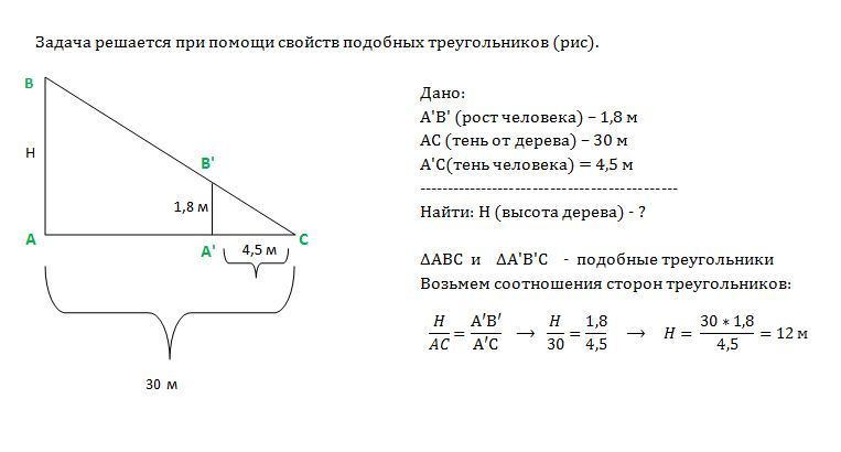 В солнечное утро человек ростом h= 180 см отбрасывает тень длиной l1= 4,5 м. Тень от дерева высотой H имеет длину l2= 30 м. Найти высоту дерева H