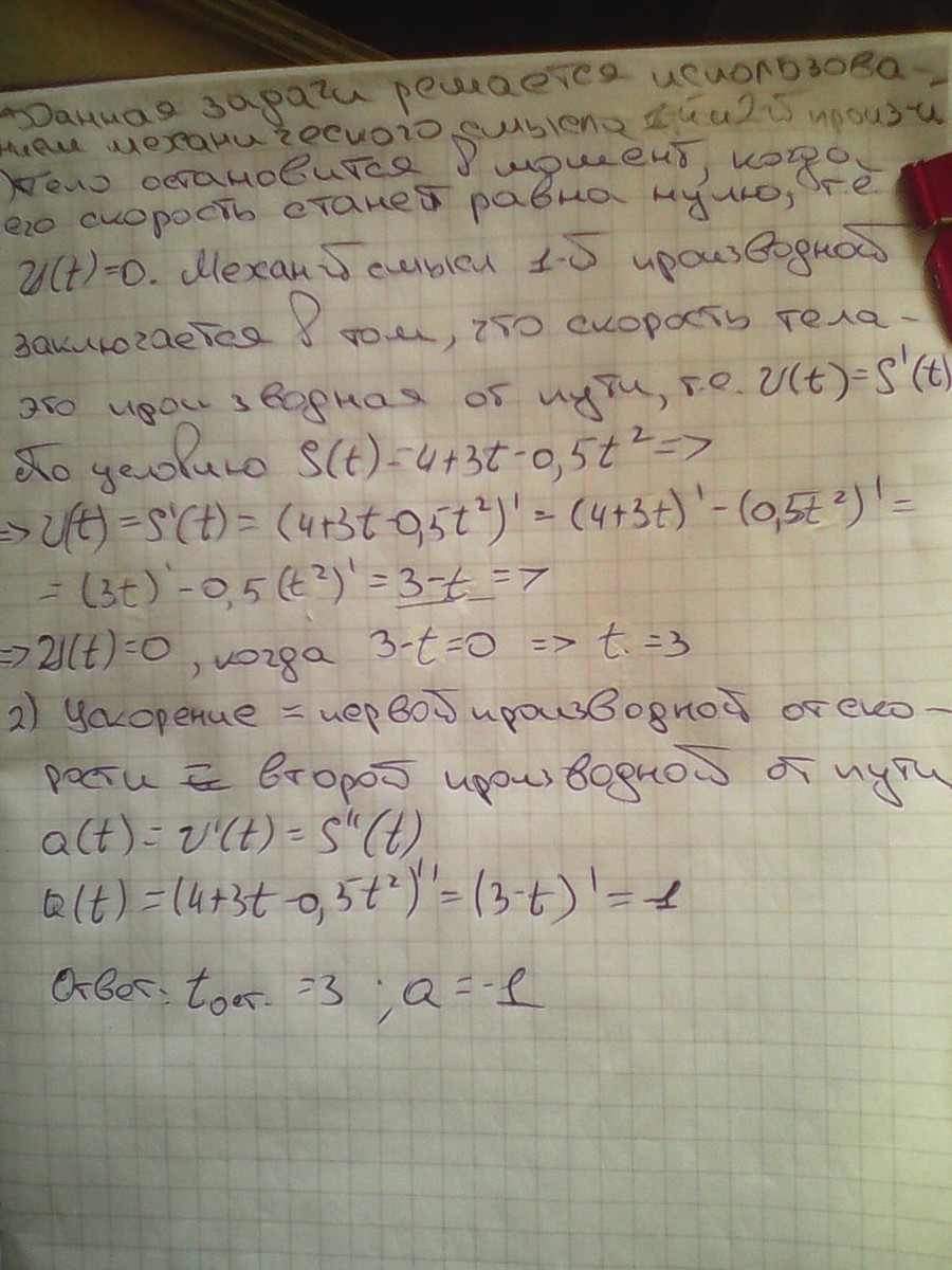 ПОМОГИТЕ ПОЖАЛУЙСТА!!. МНЕ ОСТАЛОСЬ РЕШИТЬ ОДИН ПРИМЕР, А Я НЕ ЗНАЮ КАК ЕГО ДЕЛАТЬ, НУ ПОМОГИТЕ БУДЬТЕ ЛЮДЬМИ. S=4+3t-0,5t^2 - закон движения тела. В какой момент времени тело остановиться? найти ускорение в этот момент времени?
