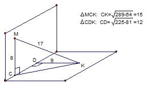В перпендикулярных плоскостях а и в проведены перпендикуляры МС и КД к линии их пересечения СД. Вычислите длину отрезка СД если МС=8см КД=9см МК=17см. ПОМОГИТЕ РЕШИТЬ НЕ МОГУ УМОЛЯЮ ПОМОГИТЕ