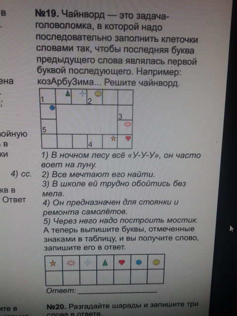 19 волк клад доска ангар ров это же чайнворд последняя буква является первой для следующего - написано же в задании
