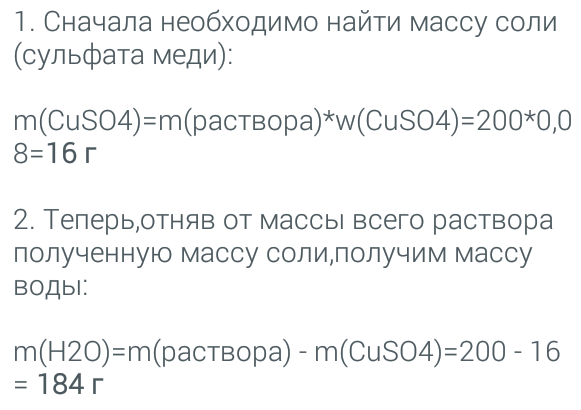 Рассчитайте массы сульфата меди (2) и вода,которые необходимы для приготовления 8%-ного раствора массой 200 г