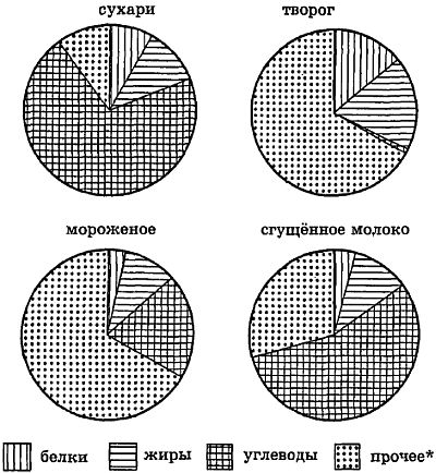 на диаграмме показано распределение питательных веществ в сливочных сухарях твороге сливочном мороженном и сгущенном молоке Определите по диаграмме в каком продукте содержание углеводом наибольшее.