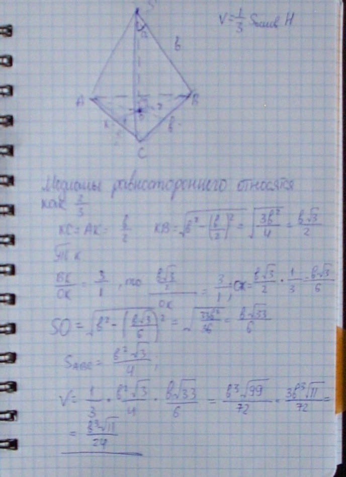 боковое ребро правильной треугольной пирамиды равняется b и образует угол a с высотой пирамиды .Найти объем пирамиды