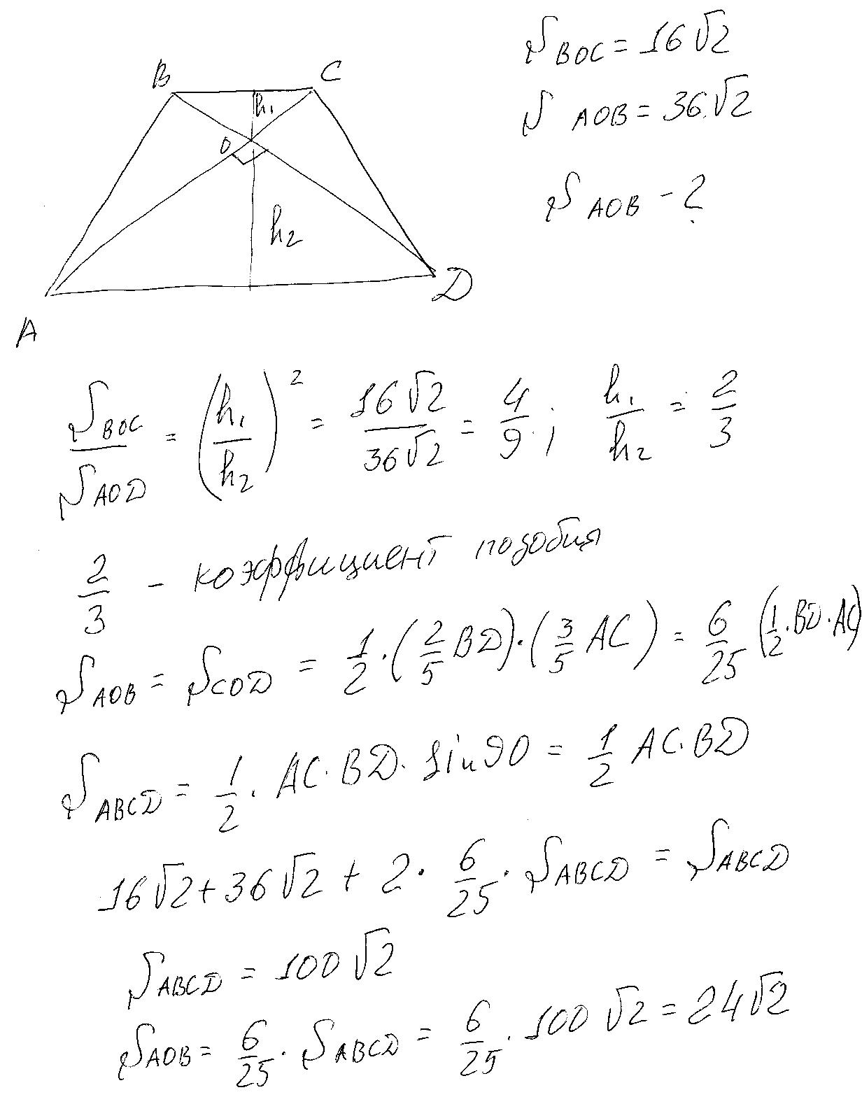 ABCD - трапеция, BC параллельно AD, О - точка пересечения ее диагоналей, причем AC перпендикулярно BD; площадь треугольника BOC = 16 под корнем 2 См2, , площадь треугольника AOD = 36 под корнем 2 см2, AB=CD. найдите площадь треугольника AOB.