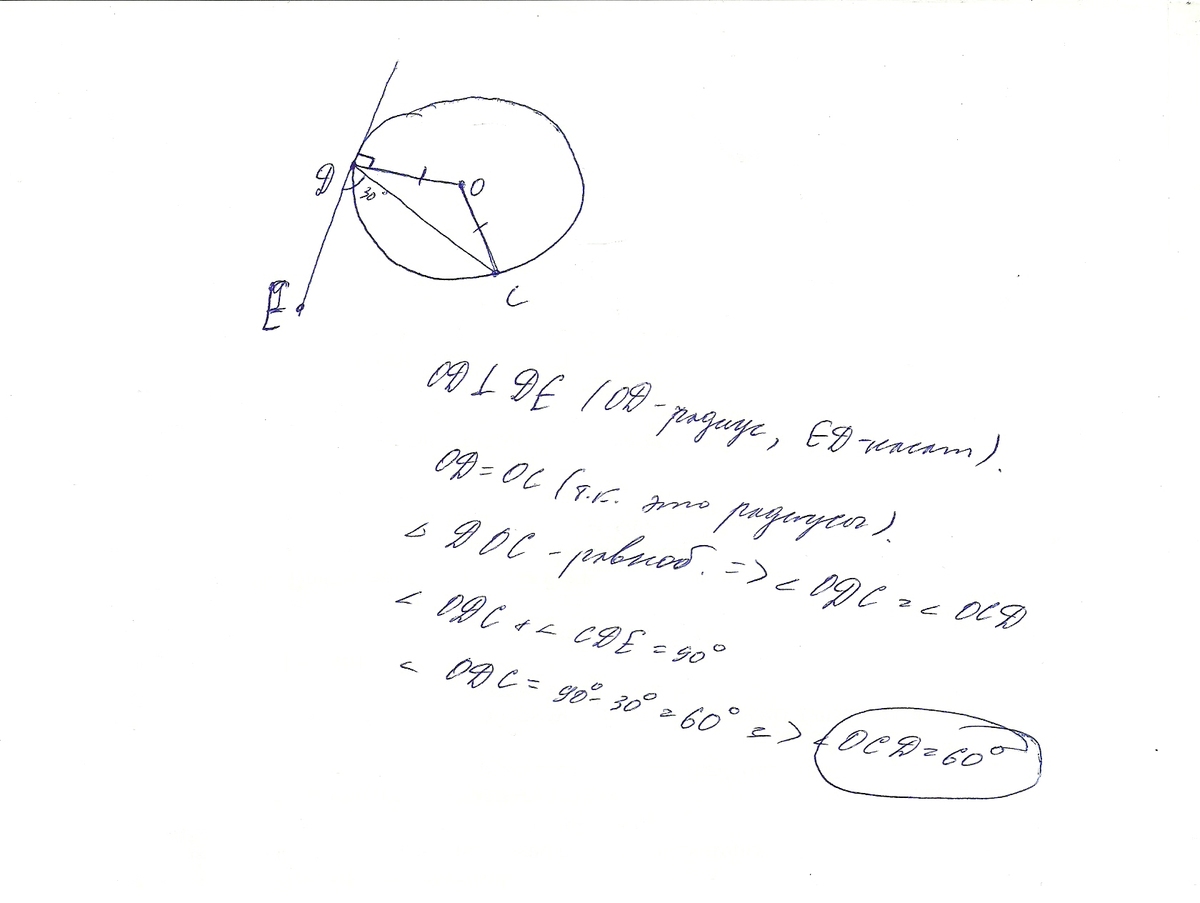 О-центр окружности. Точки D и С лежат на окружности. DУ - касательная к окружности, проходящая через точку D. Угол ЕDС = 30 градусов. Найти градусную меру угла ОСD