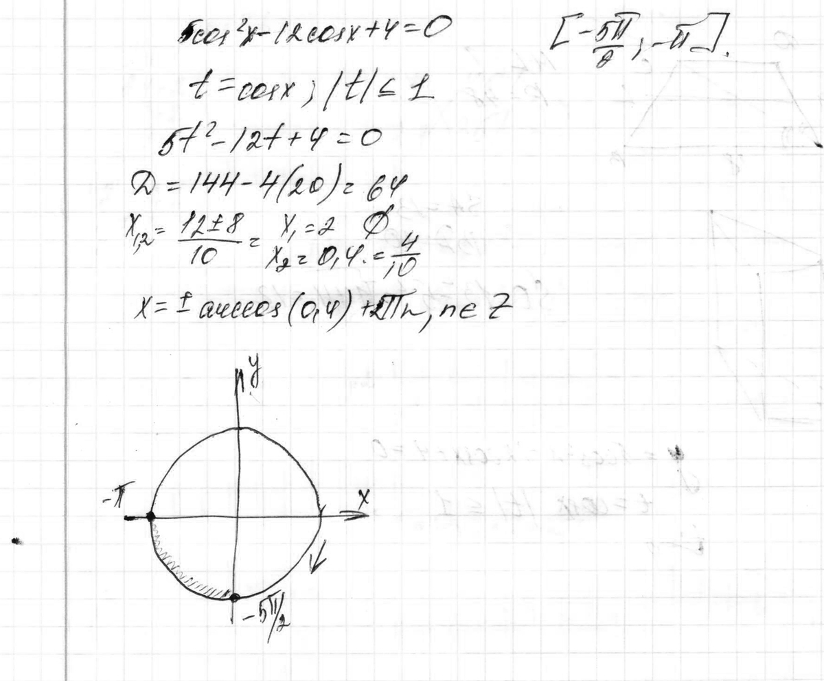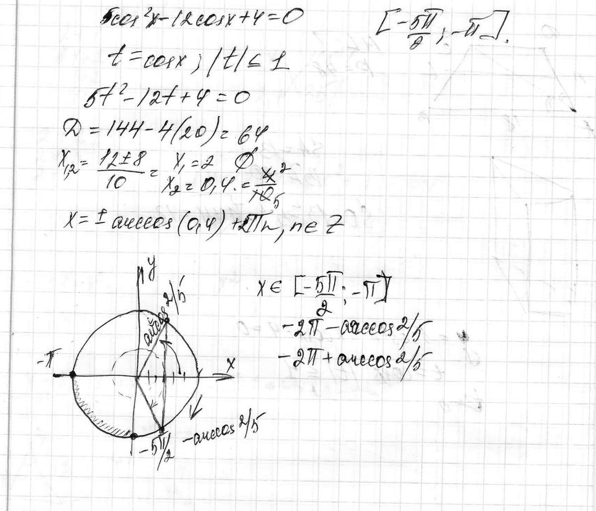 Помогите пожалуйста,очень нужно(( Решите уравнение 5cos²x-12cosx+4=0 и найдите корни пренадлежащие отрезку [-5π/2;-π]