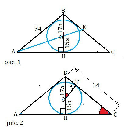 В равнобедренном треугольнике центр вписанной окружности делит высоту в отношении 17 : 15, а боковая сторона равна 34 см. Найдите основание треугольника.