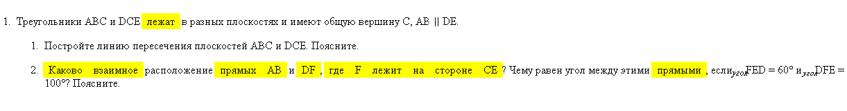 Треугольники ABC и DCE лежат в разных плоскостях и имеют общую вершину С, AB||DE. Каково взаимное положение прямых AB и DF, где F лежит на стороне CE? Чему равен угол между этими прямыми, если уголFED=60 градусов и уголDFE=100 градусов? Поясните.